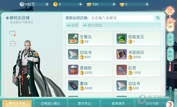 玩家在商摊界面里的全部出,可以找到公示和在售的页面,玩家选择关注可以查看收藏小店。玩家也可以在商摊界面里,去更改自身店铺的名称,以及店铺的公告信息。